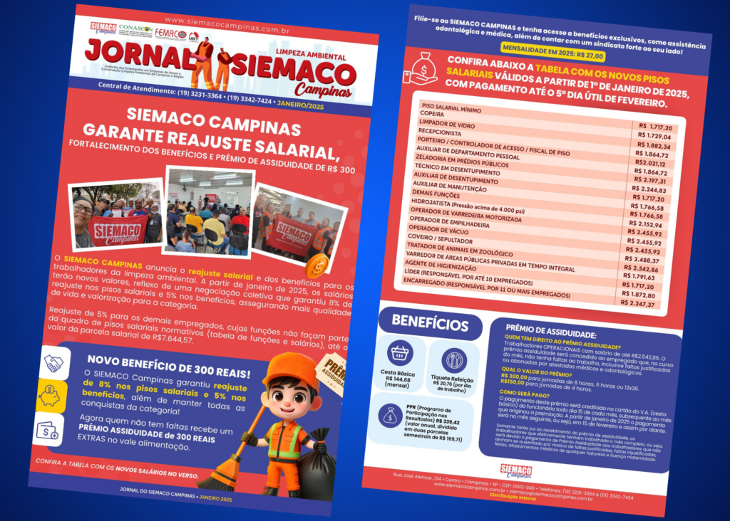 O SIEMACO CAMPINAS lançou seu novo jornal da Limpeza Ambiental com todas as conquistas garantidas para a categoria em 2025. Nele, você encontra os detalhes sobre o reajuste de 8% nos pisos salariais e 5% nos benefícios, além de informações sobre estabilidade, auxílio-creche, cesta básica, e outros avanços importantes para os trabalhadores da limpeza ambiental.